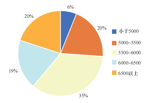 韓冬等對我國抽水蓄能站點(diǎn)資源評價(jià)及分布進(jìn)行了研究,根據(jù)抽水蓄能平均造價(jià)對各地級市資源稟賦按5級進(jìn)行了分級量化,初步表明抽水蓄能電站具備執(zhí)行標(biāo)桿電價(jià)的條件,但是按地級市劃分的資源分區(qū)較復(fù)雜,分區(qū)難連成片,不利于政策執(zhí)行[9]。從鼓勵(lì)先進(jìn)、降低價(jià)格管理成本考慮,本文進(jìn)一步研究了全國劃分3~5個(gè)資源區(qū)、每個(gè)省盡量一個(gè)資源區(qū)的可行性。標(biāo)桿容量電價(jià)的基礎(chǔ)是合理可行的資源分區(qū)。對全國各地區(qū)500多個(gè)正在開展前期工作的抽水蓄能電站單位千瓦投資進(jìn)行統(tǒng)計(jì),單位千瓦投資范圍主要在4800~7000元/kW,不同單位千瓦投資區(qū)間抽水蓄能數(shù)量比例如圖1所示。