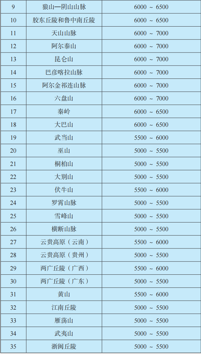 抽水蓄能電站需要地形高差,將各抽水蓄能站點(diǎn)疊在山脈地形圖上,根據(jù)逐個(gè)統(tǒng)計(jì)比較,各山脈抽水蓄能資源區(qū)分區(qū)內(nèi)[10],詳見表3。