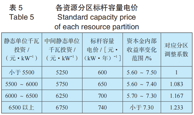 以各類資源區(qū)中間靜態(tài)單位千瓦投資對應(yīng)的容量電價(jià)作為該資源區(qū)的標(biāo)桿容量電價(jià),一類資源區(qū)標(biāo)桿容量電價(jià)取 600元/(kW·年),二類資源區(qū)標(biāo)桿容量電價(jià)取650元/(kW·年),三類資源區(qū)標(biāo)桿容量電價(jià)取700元/(kW·年),四類資源區(qū)標(biāo)桿容量電價(jià)取740元/(kW·年)。
