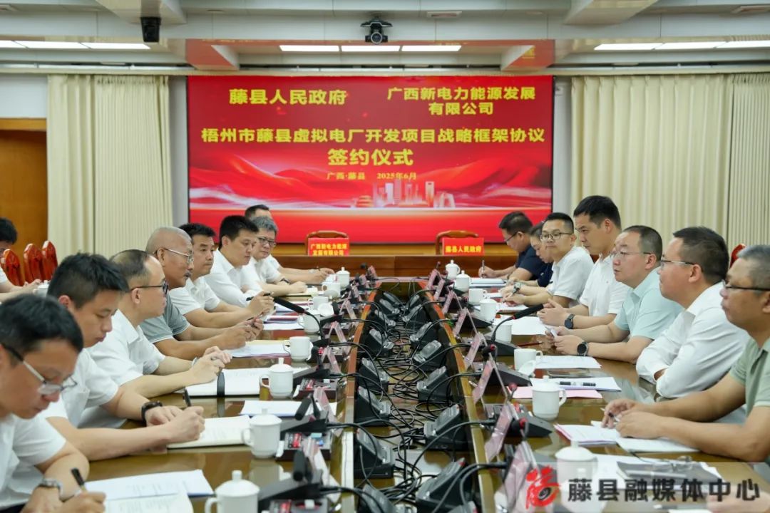 中國儲能網(wǎng)訊:6月20日,藤縣人民政府與中國南方電網(wǎng)廣西新電力能源發(fā)展有限公司舉行戰(zhàn)略框架協(xié)議簽約儀式,成功簽署虛擬電廠戰(zhàn)略框架協(xié)議,標(biāo)志著廣西首個縣域虛擬電廠項目在藤縣正式啟動建設(shè),為推動能源綠色低碳轉(zhuǎn)型、加快新型電力系統(tǒng)建設(shè)注入強勁動力。縣委書記杜誠,縣委常委、常務(wù)副縣長孫鐵軍,縣委常委、辦公室主任凌用全參加簽約儀式。廣西新電力集團三級職員、副總師盧靜,廣西電網(wǎng)公司新興業(yè)務(wù)與產(chǎn)業(yè)金融部高級經(jīng)理譚孟壹見證簽約。
