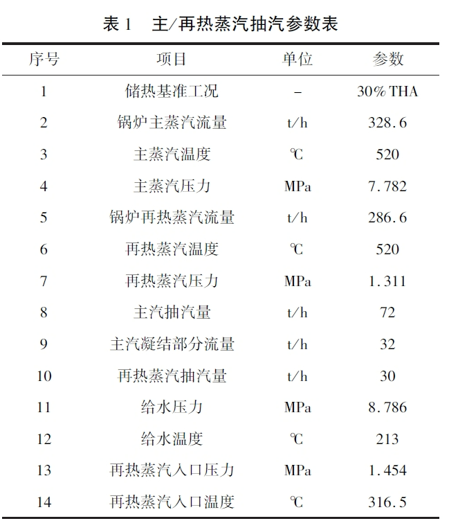 本系統(tǒng)方案儲(chǔ)熱基準(zhǔn)工況設(shè)定為30%THA,根據(jù)汽機(jī)熱平衡圖,30%THA負(fù)荷主汽參數(shù)為520℃/7.782MPa,再熱蒸汽參數(shù)為520℃/1.454MPa。根據(jù)系統(tǒng)方案抽汽蓄能調(diào)峰區(qū)間為30%~24.%THA,為滿足調(diào)峰要求,同時(shí)抽取主、再熱蒸汽,經(jīng)過(guò)核算主汽抽汽量為72t/h,其中32t/h蒸汽用于釋放顯熱和潛熱加熱熔鹽冷凝為水,經(jīng)過(guò)循環(huán)泵加壓與給水參數(shù)匹配,剩余40t/h主汽只通過(guò)釋放顯熱加熱熔鹽,換熱后的蒸汽參數(shù)經(jīng)過(guò)減溫減壓與冷段參數(shù)進(jìn)行匹配。
