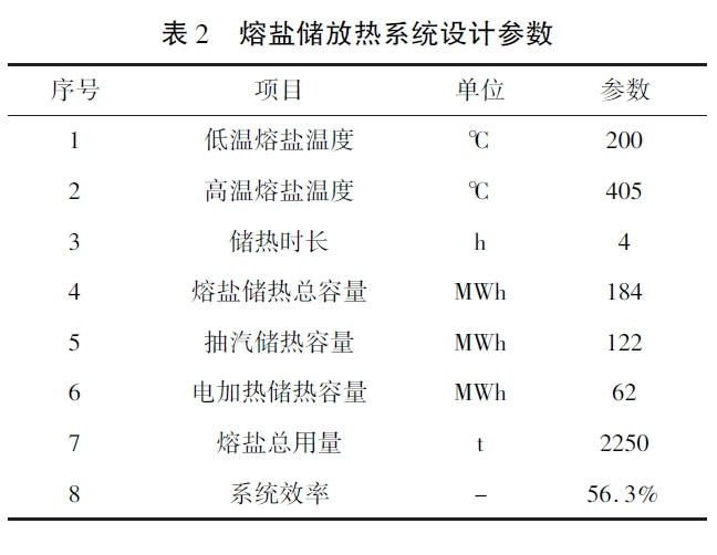 通過(guò)系統(tǒng)熱平衡計(jì)算,本熔鹽儲(chǔ)熱系統(tǒng)總儲(chǔ)熱容量為184MWh,Hitec三元熔鹽總用量為2250t,其中通過(guò)抽汽加熱熔鹽的儲(chǔ)熱容量為122MWh,電加熱熔鹽部分的儲(chǔ)熱容量62MWh。