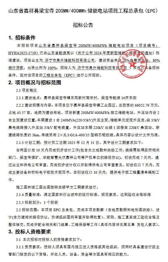 中國儲能網(wǎng)訊:6月25日,濟寧市昊升儲能科技有限公司發(fā)布山東省嘉祥縣梁寶寺200MW/400MWh儲能電站項目工程總承包(EPC)招標公告。項目位于山東省濟寧市嘉祥縣,項目新建 200MW/400MWh獨立儲能電站,升壓站內(nèi)設(shè)2臺主變建設(shè)位置,本期建設(shè)1臺240MVA(220/35kV)升壓主變,儲能單元逆變升壓后,經(jīng) 35kV集電線路接入升壓站 35kV 配電裝置。預計完工日期2025年12月31日。