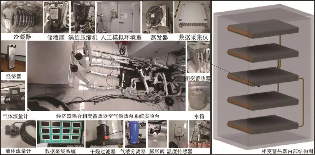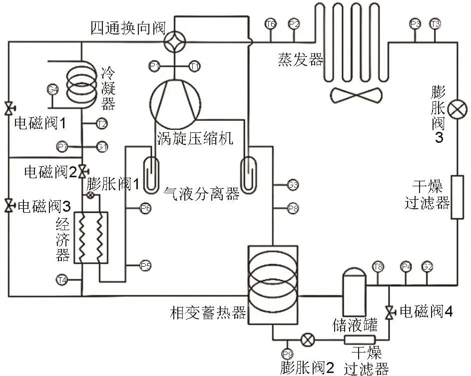 基于上述調(diào)研可發(fā)現(xiàn)準二級壓縮技術(經(jīng)濟器補氣技術)與儲能技術(相變蓄熱技術)均有助于空氣源熱泵在低溫環(huán)境下的性能提升。為確保更廣泛用戶群體在極端氣候條件下的供暖需求,上述系統(tǒng)的制熱效率及適用性仍需進一步優(yōu)化。在前期研究基礎上,該工作將準二級壓縮技術(經(jīng)濟器補氣技術)與儲能技術(相變蓄熱技術)相結合,借助實驗方法探究新系統(tǒng)在不同外界溫度下的制熱量、COP、排氣溫度等關鍵宏觀參數(shù)的變化規(guī)律。