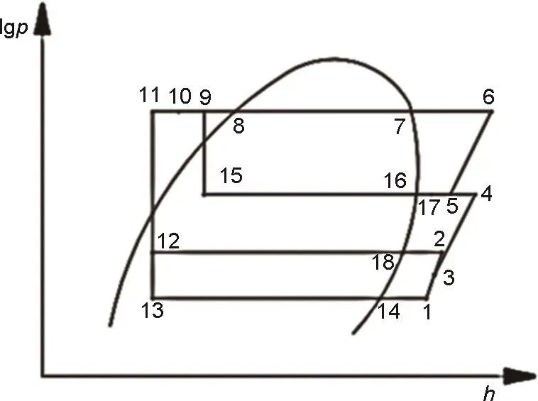 圖2 經(jīng)濟器耦合相變蓄熱器的空氣源熱泵系統(tǒng)壓焓圖