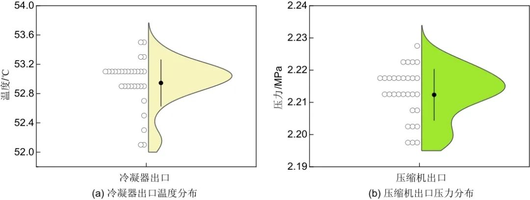 圖3 數(shù)據(jù)采集300 s內(nèi)冷凝器出口溫度和壓縮機出口壓力分布圖:(a) 冷凝器出口溫度分布;(b) 壓縮機出口壓力分布