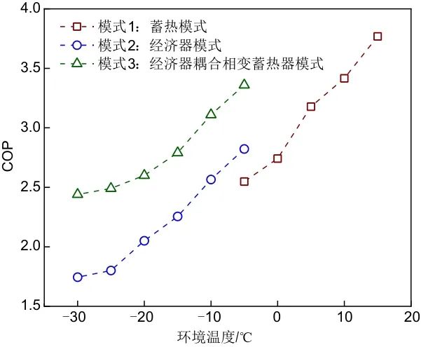 圖6 不同運行模式下COP隨環(huán)境溫度的變化