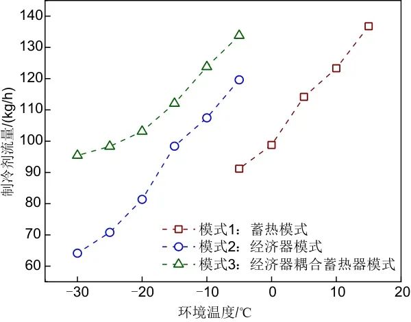圖7 不同運行模式下制冷劑流量隨環(huán)境溫度的變化