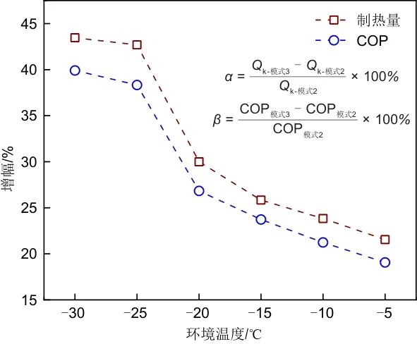 為了進一步比較模式2和模式3的系統(tǒng)制熱量和COP的大小,以模式2作為基準采用相對增幅來說明此問題,制熱量相對增幅()與COP相對增幅(β)的表達式如下: