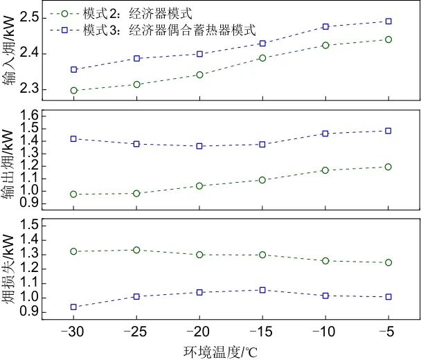圖10為系統(tǒng)的輸入?、輸出?以及?損隨環(huán)境溫度的變化情況。由圖可知,雖然兩種模式的輸入?均隨著環(huán)境溫度的下降而減小,但模式3的輸出?卻出現(xiàn)先下降后上升的趨勢,且模式3的?損在升高后又出現(xiàn)下降現(xiàn)象。這是由于環(huán)境溫度的降低直接導致了制冷劑流量的下降,進而引起輸入?和輸出?的下降。而模式3中輸出?下降后又出現(xiàn)上升趨勢,主要是由于蓄熱器的加入減緩了系統(tǒng)內(nèi)制冷劑流量下降的速度,也就是制熱量下降幅度小于溫差增加的幅度。