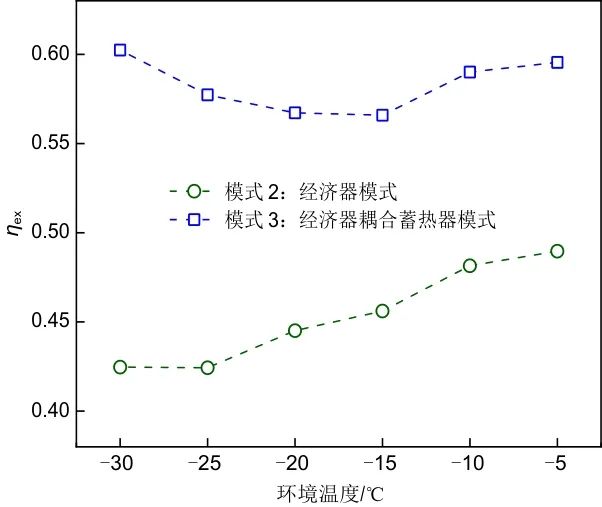 圖11展示了?效率隨環(huán)境溫的度變化情況。在模式2中,?效率隨著環(huán)境溫度的降低而降低,而在模式3中,隨著環(huán)境溫度的降低,?效率呈現(xiàn)先降后升的趨勢。根據(jù)?平衡關系,?效率受到?損失和輸出?的影響,由于壓縮機功率的變化很小,?損失的增加和輸出?的減少會導致?效率的降低。值得注意的是,模式3中?效率始終介于55%~60%,即使環(huán)境溫度降低,?效率也相對穩(wěn)定。