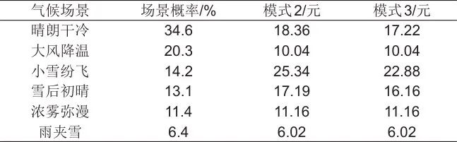 表3給出了居民建筑只采用空氣源熱泵供熱多場景的日運行成本。從計算結果可以看出在不考慮其他因素時采用經(jīng)濟器耦合相變蓄熱器(即準二級壓縮耦合儲能裝置)的空氣源熱泵在所選建筑供暖運行時的經(jīng)濟性較高。模式3日運行成本費用比模式2低4.63元。相變蓄熱器在低溫環(huán)境下可以通過提高制熱量和COP提高系統(tǒng)的經(jīng)濟性,且供暖場景的平均氣溫越低,模式3的經(jīng)濟性優(yōu)勢比模式2越大,在氣溫最低的小雪紛飛場景中模式3相比模式2的日運行成本低11%。