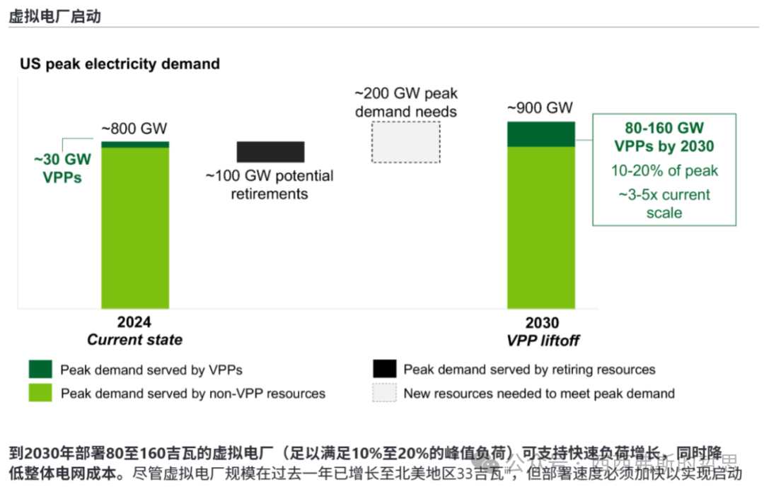 - 報告預(yù)測,到2030年,美國VPP的規(guī)模有望增長三倍,達(dá)到80-160吉瓦(GW),可以滿足全國10-20%的峰值負(fù)荷需求。