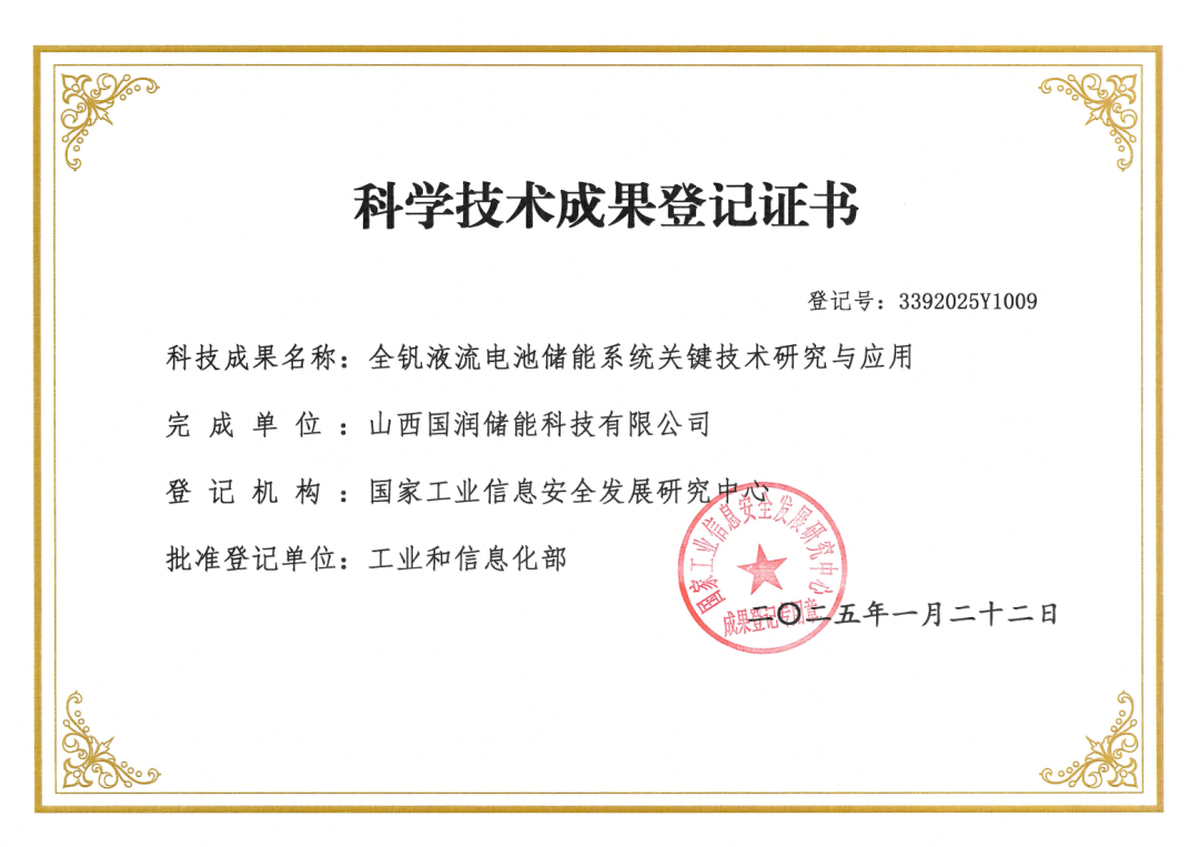 經(jīng)認(rèn)證報(bào)告評(píng)定,國潤儲(chǔ)能全釩液流電池儲(chǔ)能系統(tǒng)整體技術(shù)水平達(dá)到國內(nèi)領(lǐng)先,各項(xiàng)關(guān)鍵指標(biāo)及技術(shù)達(dá)到國際先進(jìn)水平。對(duì)開發(fā)商用釩液流電池的應(yīng)用起到了支撐作用。經(jīng)濟(jì)、社會(huì)效益顯著,應(yīng)用前景廣闊。