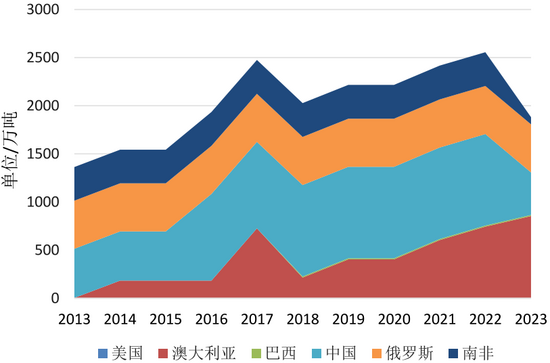 根據美國地質調查局不完全統(tǒng)計,截至2023年底,全球釩儲量超過6300萬噸(金屬量,下同),其中已認定的釩資源中符合當前采掘和生產要求的釩礦儲量約為1882萬噸,主要分布于澳大利亞、俄羅斯、中國和南非四國。