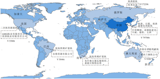 圖6:2022年世界主要資源型釩生產企業(yè)及產量(折金屬釩-噸)分布