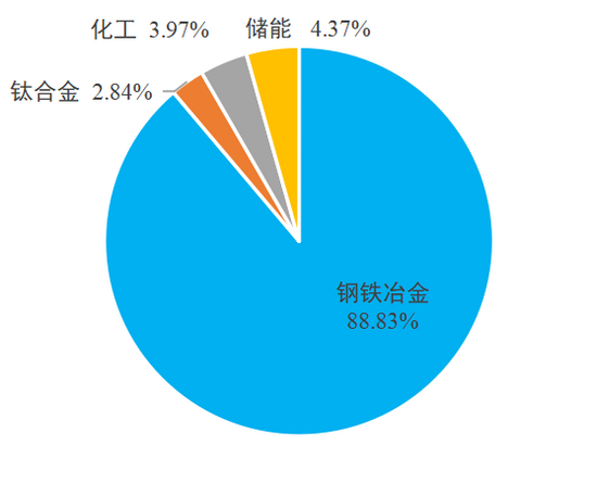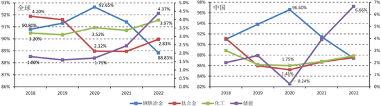 從消費結構來說,釩作為一種重要的合金添加劑,能提高鋼鐵的硬度和抗拉強度。鋼鐵冶金為其主要下游應用領域。2022年,全球約88.83%的釩應用于鋼鐵冶金領域。