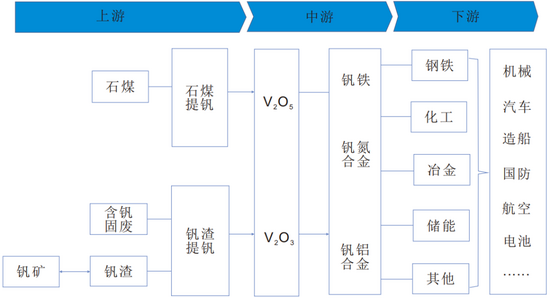 從產業(yè)鏈看,釩產業(yè)鏈上游原料主要為含釩礦產、釩渣以及含釩固廢;中游釩制品主要為五氧化二釩、三氧化二釩等氧化釩;下游應用領域包括鋼鐵冶金、儲能、鈦合金和化工等領域。