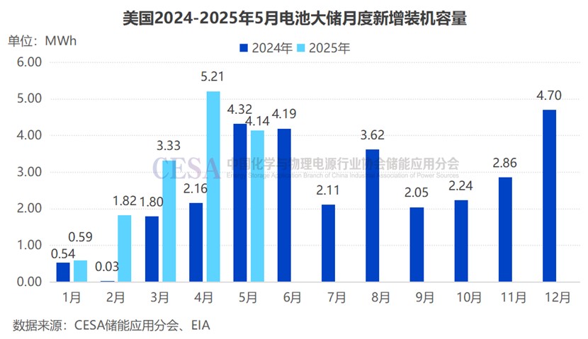 CESA儲(chǔ)能應(yīng)用分會(huì)基于EIA公示項(xiàng)目分析,美國(guó)2025年1-5月共60個(gè)大型電池儲(chǔ)能項(xiàng)目相繼投運(yùn),新增裝機(jī)共4.618GW/15.09GWh,較之去年同期增長(zhǎng)43.74%(功率)/70.45%(容量),平均時(shí)長(zhǎng)3.27小時(shí),較之2024年的2.75小時(shí)顯著提升。2025年3月、4月、5月各有一個(gè)GWh級(jí)儲(chǔ)能項(xiàng)目新投運(yùn),4月新增裝機(jī)容量更是創(chuàng)新高,超5GWh。