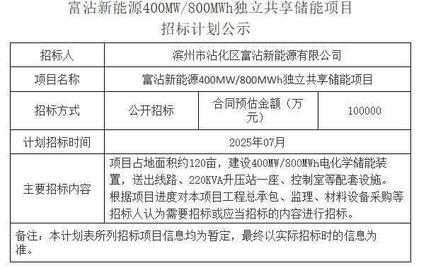 中國儲能網(wǎng)訊:6月30日,富沾新能源山東濱州400MW/800MWh獨(dú)立共享儲能項目招標(biāo)計劃發(fā)布,招標(biāo)人為濱州市沾化區(qū)富沾新能源有限公司,由濱州市沾化區(qū)鑫誠商貿(mào)有限公司全資持股。