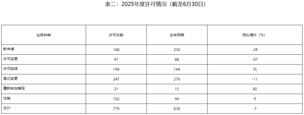 截至6月30日,2025年共辦理承裝(修、試)電力設(shè)施業(yè)務(wù)779件,較去年同期減少7%。其中,新申請168件,較去年同期減少29%;許可變更47件,較去年同期減少47%;許可延續(xù)194件,較去年同期增長35%;注銷102件,較去年同期增長9%。