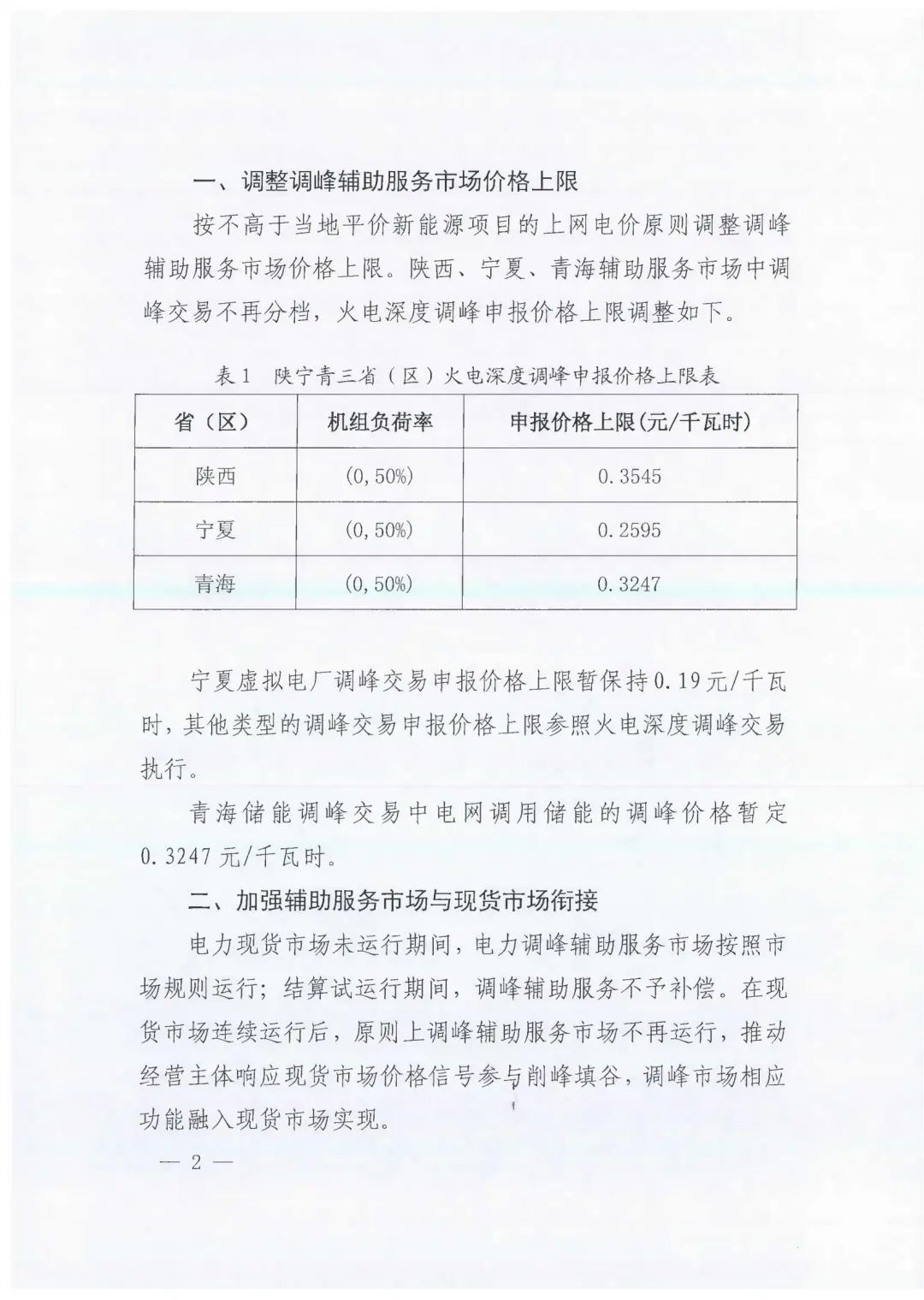 文件明確,按不高于當?shù)仄絻r新能源項目的上網(wǎng)電價原則調整調峰輔助服務市場價格上限。陜西、寧夏、青海輔助服務市場中調峰交易不再分檔,火電深度調峰申報價格上限調整如下: