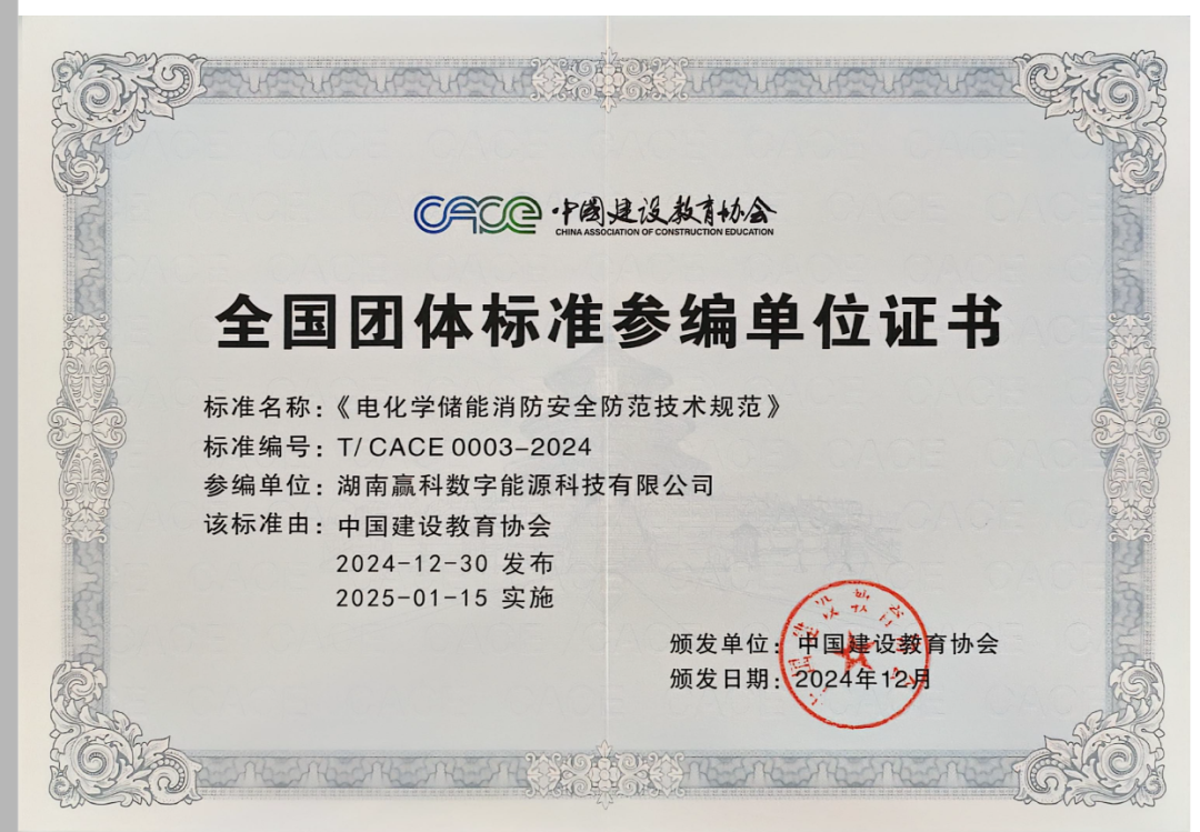 中國儲(chǔ)能網(wǎng)訊:自成立以來,始終致力于將自身在工商業(yè)儲(chǔ)能領(lǐng)域積累的深厚技術(shù)底蘊(yùn)與豐富項(xiàng)目經(jīng)驗(yàn),回饋于行業(yè)標(biāo)準(zhǔn)建設(shè),積極“獻(xiàn)計(jì)獻(xiàn)策”。2024年12月,贏科數(shù)能成為中國建設(shè)教育協(xié)會(huì)《電化學(xué)儲(chǔ)能消防安全防范技術(shù)規(guī)范》團(tuán)體標(biāo)準(zhǔn)的重要編制單位之一,推動(dòng)儲(chǔ)能安全規(guī)則制定。