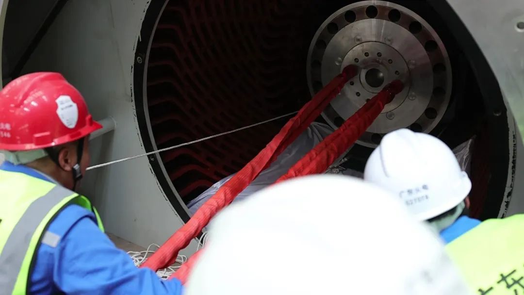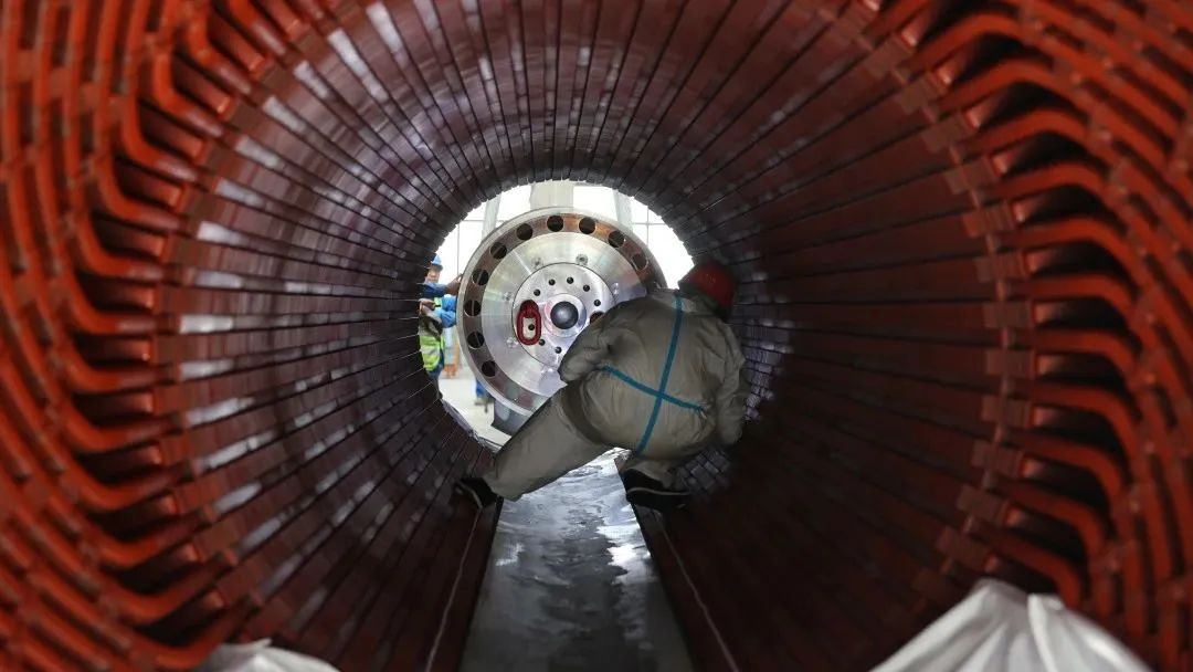 中國儲能網(wǎng)訊:“成功完成!”歡呼聲響起,7月1日16時50分,重約65噸、長度為13米的轉(zhuǎn)子,在機械和人力共同配合下,穩(wěn)穩(wěn)地安裝到了定子中。轉(zhuǎn)子和定子的間隙僅為2.4毫米,它們共同組成了甘肅酒泉300兆瓦級壓縮空氣儲能電站三大主機之一的發(fā)電機,標志著世界首臺(套)300兆瓦級人工硐室壓縮空氣儲能項目進入建設(shè)關(guān)鍵期。