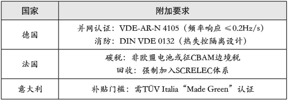 此外,歐洲部分國家對(duì)儲(chǔ)能標(biāo)準(zhǔn)有各自不同的附加要求,具體見表3。