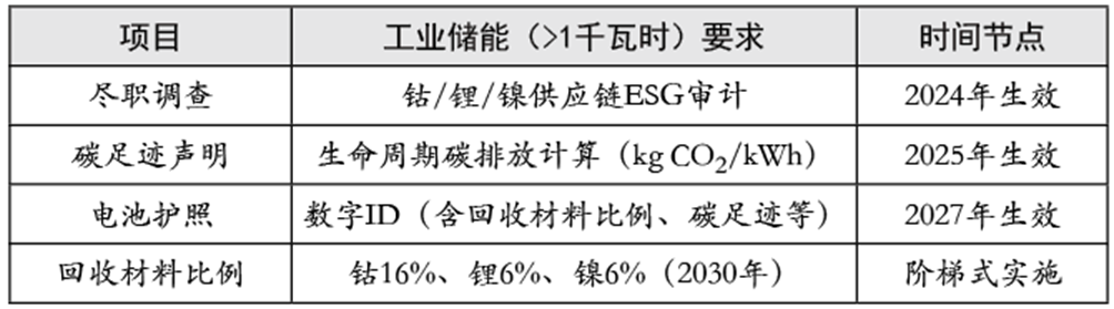 出口到歐盟的儲(chǔ)能產(chǎn)品,需滿足“法規(guī)框架+安全標(biāo)準(zhǔn) +環(huán)保要求”三位一體的嚴(yán)苛體系,涵蓋電池、電力電子、系統(tǒng)集成全鏈條,但《歐盟電池與廢電池法規(guī)》是關(guān)鍵影響因素?!稓W盟電池與廢電池法規(guī)》(EU)2023/1542于2023年8月17日正式生效,但關(guān)鍵條款分三階段實(shí)施。第一階段(從2024年2月18日開始)涉及電池盡職調(diào)查和CE標(biāo)記;第二階段(從2025年8月18日開始)要求便攜式電池可拆卸;第三階段(從2027年2月18日開始)最嚴(yán)格,涵蓋碳足跡和回收材料要求。新法規(guī)對(duì)電池碳足跡、標(biāo)志標(biāo)識(shí)、限用物質(zhì)、電池回收、關(guān)鍵材料回收利用、合規(guī)評(píng)價(jià)認(rèn)證、盡職調(diào)查、電池護(hù)照、耐久和性能要求、信息系統(tǒng)構(gòu)建等方面提出了要求,核心要求見表4。此外,要求必須在銷售國注冊EPR(如德國EAR、法國SCRELEC)并支付回收費(fèi)。