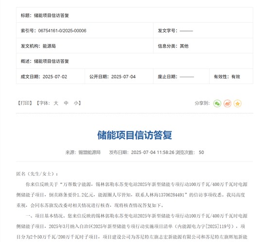 2025年3月,內(nèi)蒙古能源局發(fā)布新型儲能專項行動項目清單,萬幫數(shù)字能源旗下兩家全資子公司承建的東蘇變電站儲能項目成功入選。該項目包含兩個50萬千瓦/200萬千瓦時子工程,原定7月15日啟動建設,卻因匿名舉報陷入“倒賣路條”爭議,舉報方稱存在1.2億元索價行為。
