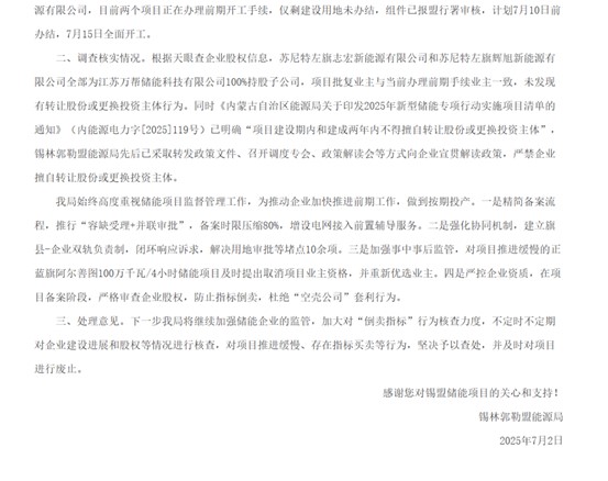 針對輿情,錫林郭勒盟能源局立即組建聯(lián)合調(diào)查組,會同東蘇旗發(fā)改委開展專項核查。經(jīng)核實,蘇尼特左旗志宏、輝旭兩家新能源企業(yè)確為江蘇萬幫儲能科技全資控股,項目備案主體與前期手續(xù)辦理方完全一致,未發(fā)現(xiàn)股權(quán)變更或投資主體替換情況。項目已通過自治區(qū)儲能專項行動審核,備案階段對企業(yè)資質(zhì)實施穿透式審查,有效防范“皮包公司”套取政策紅利。