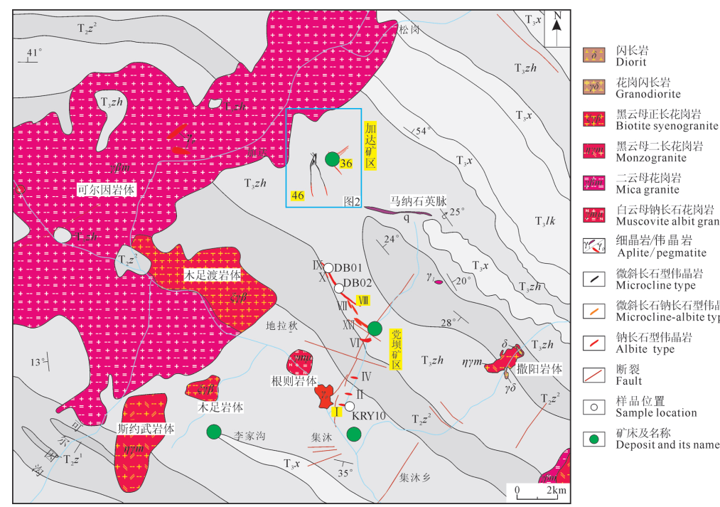 加達礦區(qū)地層為上三疊統(tǒng)侏倭組變質(zhì)長石石英砂巖、千枚巖、板巖,受區(qū)域變質(zhì)作用影響,其變質(zhì)程度達綠片巖相。加達礦區(qū)巖漿巖以可爾因二云母花崗巖為主,其呈灰白色、淺灰色,中—細?;◢徑Y(jié)構(gòu),塊狀構(gòu)造,礦物成分包括黑云母(1%~3%)、白云母(5%~10%)、長石(35%~40%)和石英(45%),以及少量的電氣石、石榴子石、鋯石等副礦物。可爾因花崗巖的邊緣或頂部礦物顆粒粗大,偉晶相發(fā)育(圖2)?;◢弾r與三疊系接觸帶附近的熱接觸變質(zhì)作用普遍,在富鈣硅質(zhì)地層的接觸帶見黑云母、透輝石、石榴子石、角閃石等變質(zhì)礦物,在富硅鋁地層的接觸帶見黑云母、白云母和少量堇青石等變質(zhì)礦物。加達礦區(qū)的褶皺為北西-南東向加達溝傾伏背斜,其與地形地貌等要素共同控制著三疊紀侏倭組、雜谷腦組等地層的分布;線狀構(gòu)造極其發(fā)育,以北東向、北西向的節(jié)理、裂隙為主,其次為近南北向、東西向;部分走向延長較大的線狀構(gòu)造,控制著偉晶巖脈、石英脈的分布(圖2、3)。