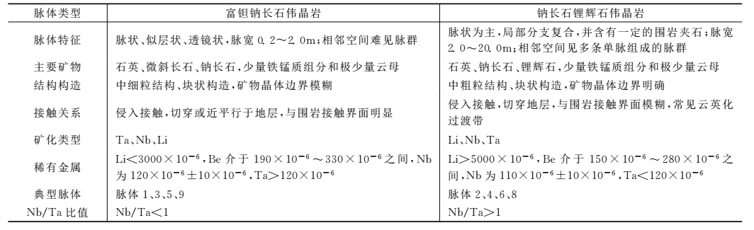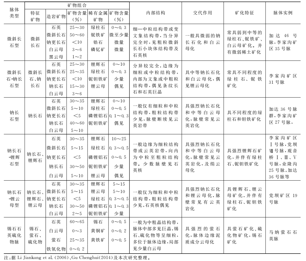 馬爾康礦田花崗偉晶巖脈多成群、成帶分布,脈體類型主要為微斜長石型、微斜長石-鈉長石型、鈉長石型、鈉長石鋰輝石型、鈉長石鋰云母型、螢石錫石硫化物型(表1)。因地形切割強烈、多期次巖漿熱液活動疊加顯著,局部脈體類型特征和脈群分帶規(guī)律性不顯著。野外地質(zhì)調(diào)查顯示礦化偉晶巖脈多分布于侏 倭 組、雜 谷 腦 組 的 變 質(zhì) 長 石 石 英 砂 巖巖性段,空間上受北西向、北東向兩組共軛節(jié)理控制。礦脈 空 間 分 布 于 可 爾 因 巖 體 外 圍 水 平 距 離1500~5000m、高 程 3750~4200m 范 圍 內(nèi)。礦 脈類型 以 鈉 長 石 鋰 輝 石 型 為 主,其 走 向 長 100~ 2500m 不等,礦 化 類 型 以 鋰 為 主,兼 有 鈹、鈮、鉭、銣、錫等共伴生組分。