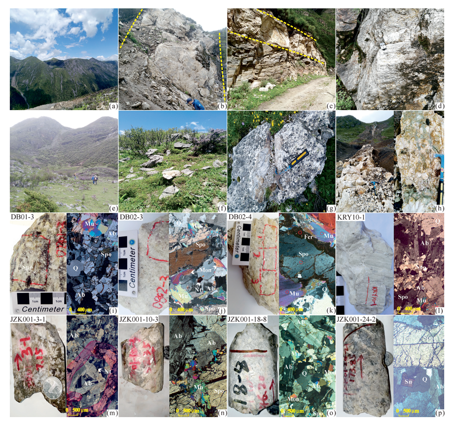 (a)—馬爾康礦田地形地貌;(b)—業(yè)隆礦區(qū)陡傾的偉晶巖脈;(c)—集沐大渡 河 邊 緩 傾 的 偉 晶 巖 脈;(d)—黨壩Ⅷ號 鈉 長 石 鋰 輝 石 偉 晶 巖 露 頭; (e)—加達礦區(qū)地形地貌及殘積-坡積礫石;(f)—加達含 鋰 輝 石 偉 晶 巖 轉(zhuǎn) 石 的 坡 積 碎 石 帶;(g)—加 達 礦 區(qū) 山 頂 平 地 殘 積 的 鋰 輝 石 偉 晶 巖 碎 石(高程4150m);(h)—加達礦區(qū)東部馬納螢石石英脈(高程4060m);(i)—黨壩Ⅷ號礦脈北段 DB01-3樣品礦物組合(高程3900m);(j)—黨壩Ⅷ號礦脈中段 DB02-3樣品礦物組合;(k)—黨壩Ⅷ號礦脈中段 DB02-4樣品礦物組合(高程3700m);(l)—地拉秋Ⅰ號脈中部 KRY10-1樣品礦物組合(高程2450m);(m)—加達JZK001鉆孔7.2m 進尺含鈮鉭鐵礦鈉長石偉晶巖脈(高程4127m);(n)—加達JZK001鉆孔58.5m 進尺含白云母鈉長石鋰輝石偉晶巖(高程4090m);(o)—加達JZK001鉆孔146m 進 尺 含 白 云 母 鈉 長 石 磷 鋰 鋁 石 鋰 輝 石 偉 晶巖(高程4029m);(p)—加達JZK001鉆孔174m 進尺含錫石鈉長 石 鋰 輝 石 偉 晶 巖(高程 4009m);Mu—白云 母;Ab—鈉 長 石;Qz—石 英;Spo—鋰 輝 石;Mon—磷 鋰 鋁 石; Fer—鐵磷鋰錳礦;Nt—鈮鉭鐵礦;Sn—錫石