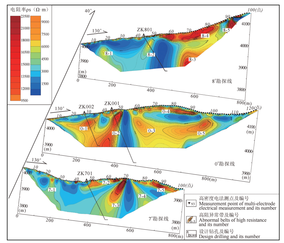 以加達礦區(qū)36號偉晶巖脈群為例,如前所述,其在山頂平地露頭較好,附近鋰輝石偉晶巖轉(zhuǎn)石帶走向延長最長,高密度電法實驗剖面(0號勘探線)測試圈定的陡傾高阻異常體地表延伸與地質(zhì)填圖圈定的鋰輝石偉晶 巖 露 頭 相 吻 合(圖4)。因此,以高密度電法圈定的陡傾高阻異常判斷偉晶巖脈露頭的傾向深部延伸,具有可行性。以0線為參考,設(shè)置多條垂直于碎石帶或鋰輝石偉晶巖露頭走向的電法剖面,展開隱伏礦脈走向追索。參考36號脈群原始露頭或其周圍 的 地 表 鋰 輝 石 轉(zhuǎn) 石 帶總 體走向 40°,設(shè)計高密度電法測深測量剖面線走向130°(圖2、4)。