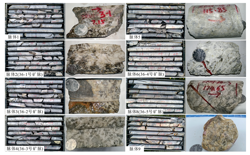 圖6 加達礦區(qū)鉆孔控制脈體巖芯及手標(biāo)本特征