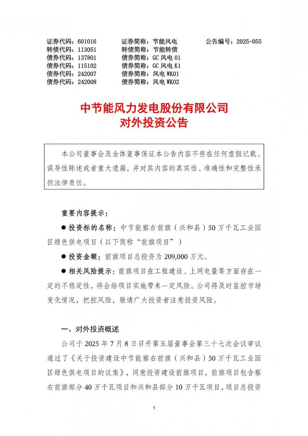中國(guó)儲(chǔ)能網(wǎng)訊:7月8日,節(jié)能風(fēng)電發(fā)布公告稱(chēng),擬投資中節(jié)能察右前旗(興和縣)50萬(wàn)千瓦工業(yè)園區(qū)綠色供電項(xiàng)目,項(xiàng)目總投資為209,000萬(wàn)元。其全資子公司中節(jié)能(察哈爾右翼前旗)風(fēng)力發(fā)電有限公司、中節(jié)能(內(nèi)蒙古)風(fēng)力發(fā)電有限公司分別作為前旗項(xiàng)目中察右前旗40萬(wàn)千瓦項(xiàng)目部分和興和縣10萬(wàn)千瓦項(xiàng)目部分的建設(shè)主體開(kāi)展相關(guān)工作。