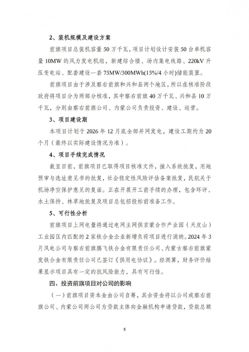 前旗項(xiàng)目由于涉及察右前旗和興和縣兩個(gè)地區(qū),所以在核準(zhǔn)階段政府將項(xiàng)目分為兩部分核準(zhǔn),其中察右前旗40萬(wàn)千瓦、興和縣10萬(wàn)千瓦,分別由察右前旗公司、內(nèi)蒙公司負(fù)責(zé)投資、建設(shè)、運(yùn)營(yíng)。