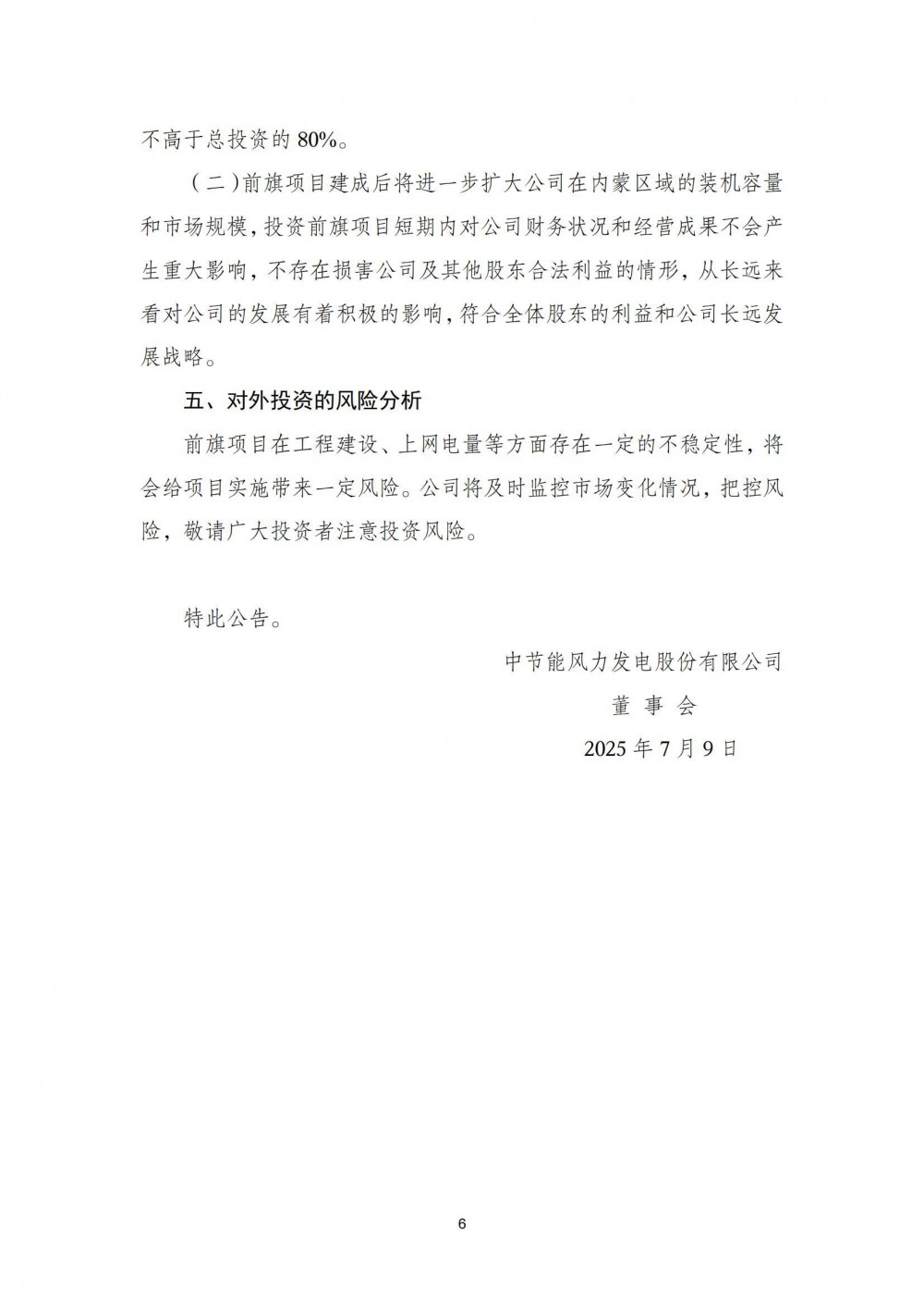 節(jié)能風(fēng)電表示,前旗項(xiàng)目建成后將進(jìn)一步擴(kuò)大公司在內(nèi)蒙區(qū)域的裝機(jī)容量和市場(chǎng)規(guī)模,投資前旗項(xiàng)目短期內(nèi)對(duì)公司財(cái)務(wù)狀況和經(jīng)營(yíng)成果不會(huì)產(chǎn)生重大影響,不存在損害公司及其他股東合法利益的情形,從長(zhǎng)遠(yuǎn)來(lái)看對(duì)公司的發(fā)展有著積極的影響,符合全體股東的利益和公司長(zhǎng)遠(yuǎn)發(fā)展戰(zhàn)略。