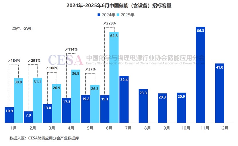6月儲能招投標市場依舊火爆。據(jù)CESA儲能應(yīng)用分會產(chǎn)業(yè)數(shù)據(jù)庫不完全統(tǒng)計,2025年6月儲能項目(含直流側(cè)設(shè)備采購)公開招標規(guī)模高達21.7GW/62.8GWh,招標容量同比增長228%,創(chuàng)2025年以來新高。