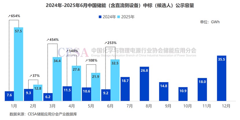 據(jù)CESA儲能應(yīng)用分會追蹤統(tǒng)計,2025年6月共182個儲能項目采招落地,其中含直流側(cè)儲能設(shè)備采購的項目總規(guī)模達11.5GW/32.5GWh,同比增長253%。其中儲能系統(tǒng)采招落地3.5GW/8.8GWh,容量占比27%;儲能EPC/PC(含直流側(cè)設(shè)備)采招落地8GW/23.7GWh,容量占比73%。