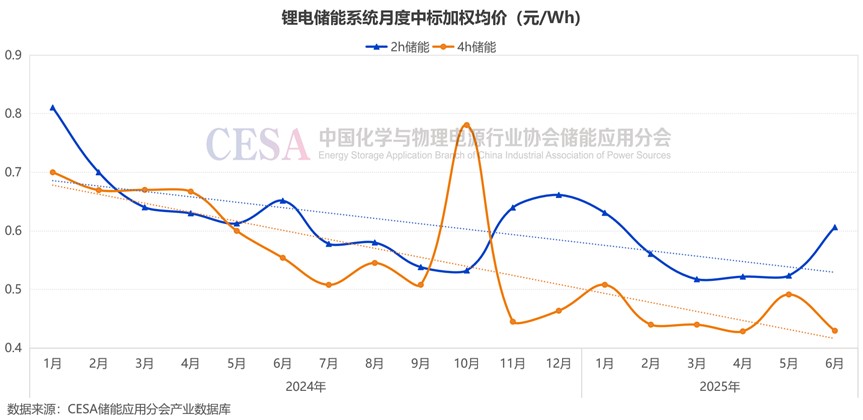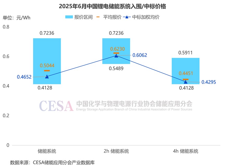 值得一提的是,6月23日,中國能建2025年度磷酸鐵鋰電池儲能系統(tǒng)集中采購項目開標,4h儲能系統(tǒng)有效報價范圍0.37-0.495元/Wh,平均報價0.4249元/Wh,2h有效報價范圍0.416-0.5764元/Wh,平均報價0.4646元/Wh。由于該項目還未公布中標(候選)人,所以未包含在6月采招落地項目入圍報價中。