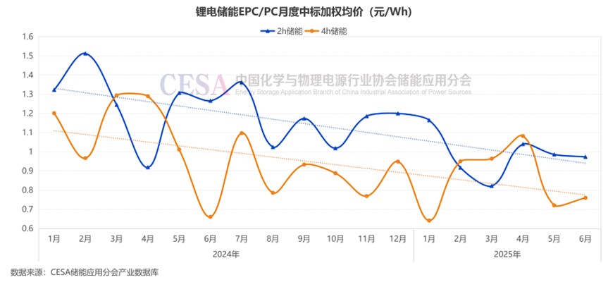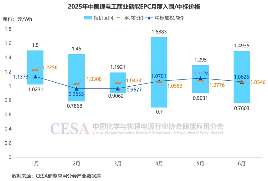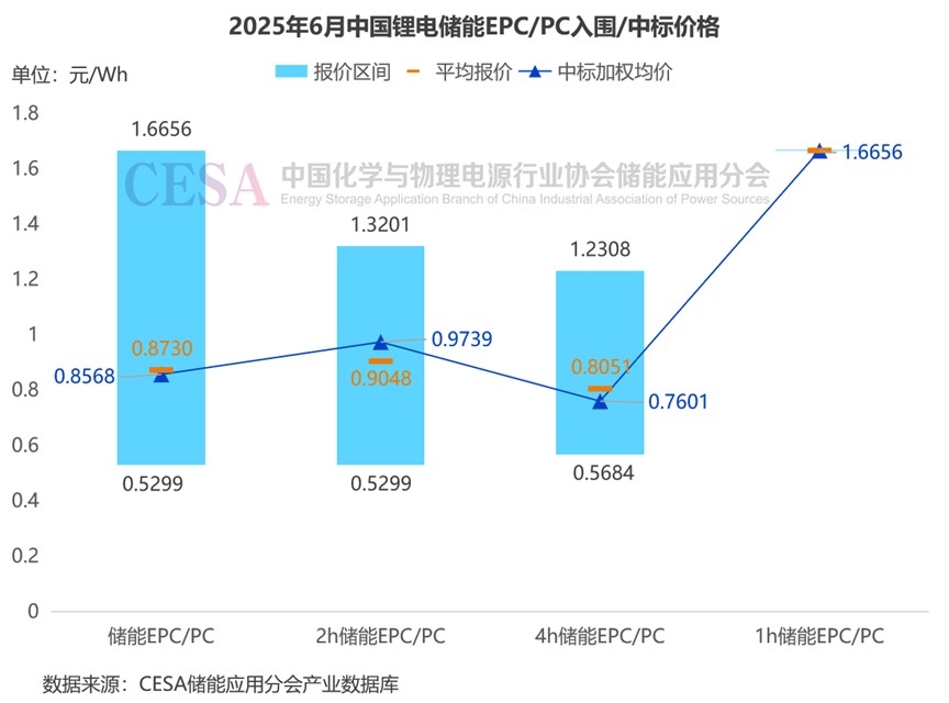 2025年6月,鋰電儲能EPC/PC(不含工商儲、固態(tài)電池儲能)入圍報價主要集中在0.5299-1.6656元/Wh,平均報價0.873元/Wh,中標加權(quán)均價0.8568元/Wh。