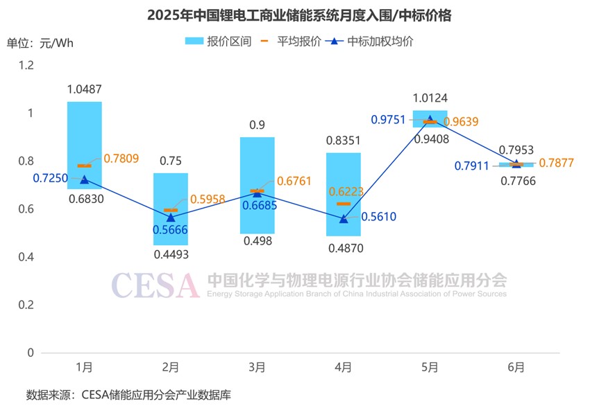 據(jù)CESA儲能應(yīng)用分會產(chǎn)業(yè)數(shù)據(jù)庫不完全統(tǒng)計,2025年6月,國內(nèi)工商業(yè)儲能系統(tǒng)入圍投標單價在0.7766-0.7953元/Wh區(qū)間內(nèi),平均報價0.7877元/Wh,中標加權(quán)均價0.7911元/Wh。最低報價來自于愉秒充公司配置10個超充站儲能設(shè)備采購,深圳英飛源技術(shù)有限公司以0.7766元/Wh的競選報價中標。