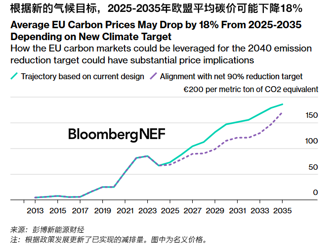 如果歐盟ETS I上限與氣候目標(biāo)一致,彭博新能源財(cái)經(jīng)預(yù)測(cè)的2025-2035年歐盟碳價(jià)平均降幅