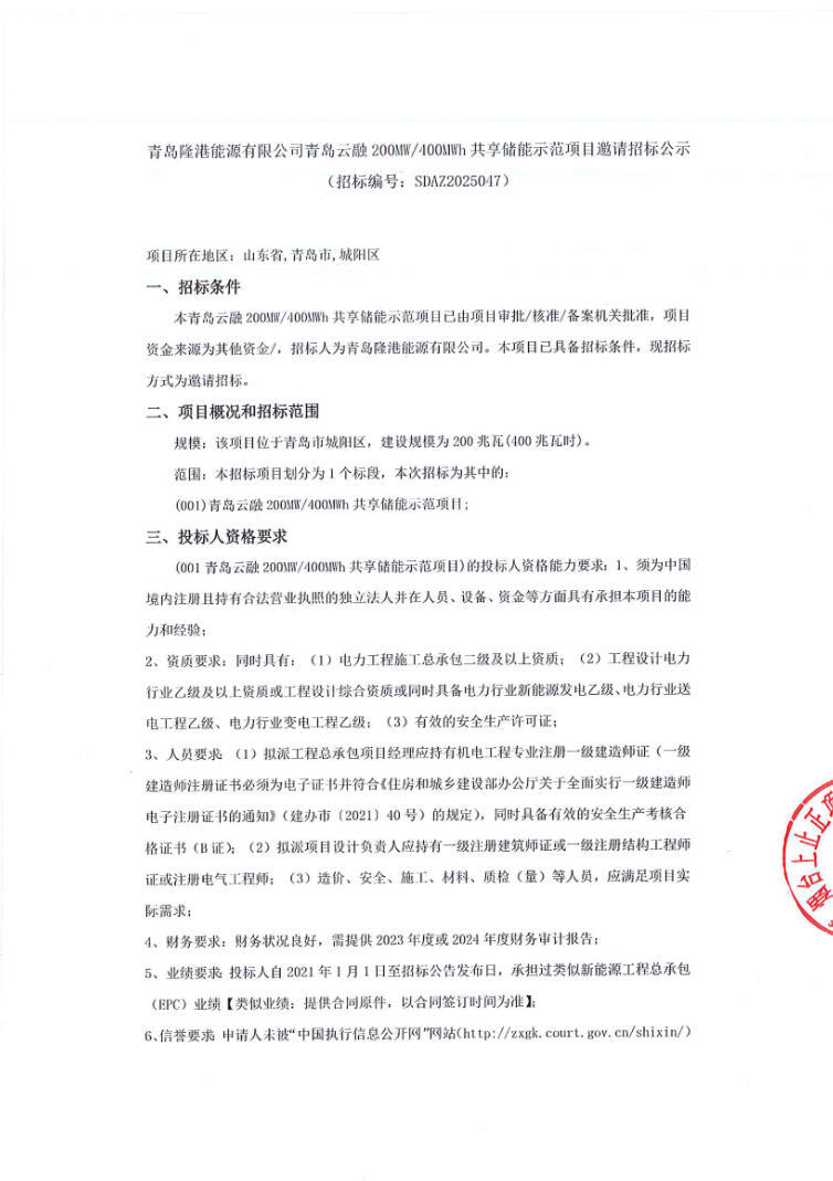 中國儲能網(wǎng)訊:7月10日,青島隆港能源有限公司青島云融200MW/400MWh共享儲能示范項目邀請招標(biāo)公示,招標(biāo)人為青島隆港能源有限公司。該項目位于青島市城陽區(qū),建設(shè)規(guī)模為200兆瓦(400兆瓦時)。