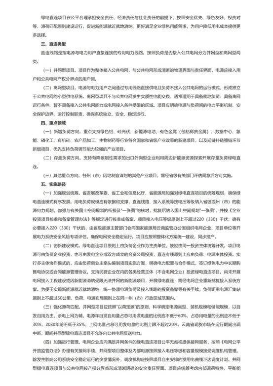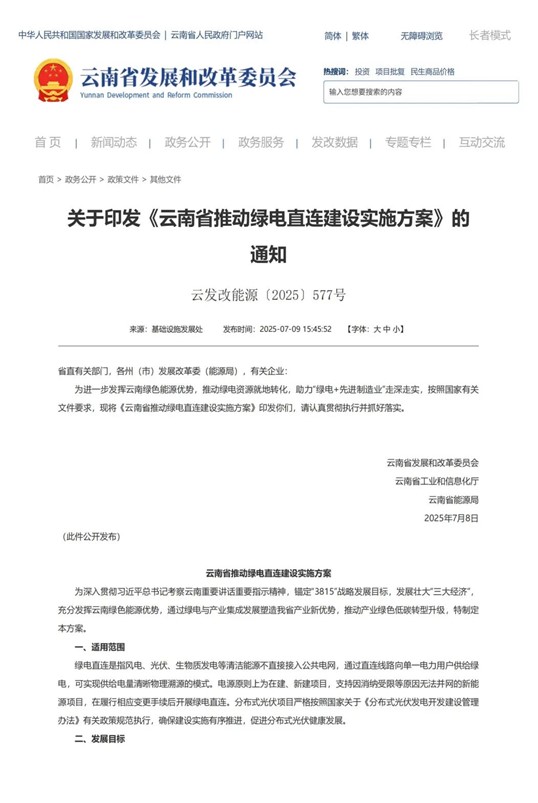 中國儲能網(wǎng)訊:2025年7月8日,云南省發(fā)改委、工信廳、能源局聯(lián)合推出《綠電直連建設實施方案》,為新能源消費模式按下“加速鍵”。這項被戲稱為“新能源界外賣直達服務”的創(chuàng)新政策,將風電、光伏發(fā)電的“新鮮電能”通過專屬“電力高速公路”直送工廠,徹底告別傳統(tǒng)電網(wǎng)的“中間商”。
