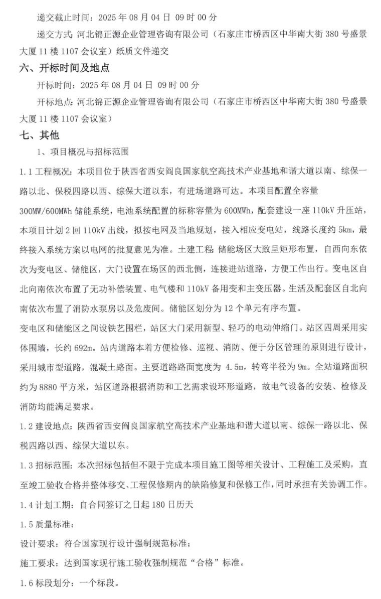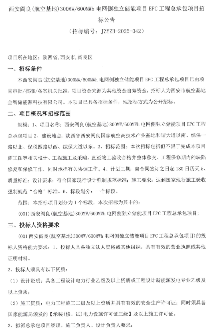 中國儲能網訊:7月14日,西安閻良(航空基地)300MW/600MWh電網側獨立儲能項目EPC工程總承包項目招標公告發(fā)布,招標人為西安市航空基地金智儲能源科技有限公司。