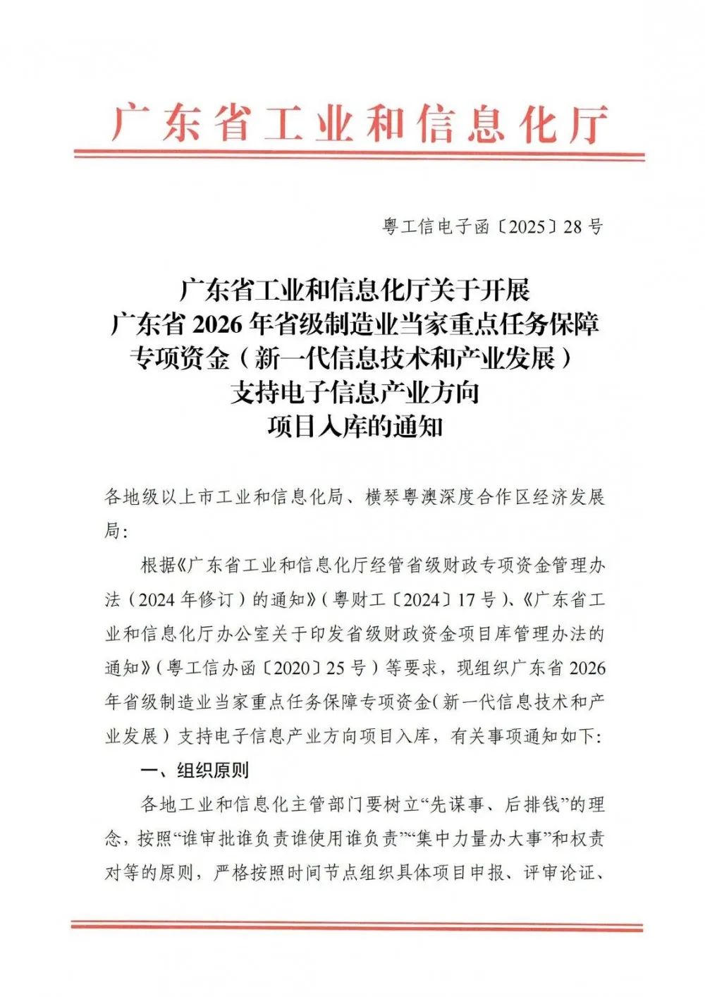 現(xiàn)將《廣東省工業(yè)和信息化廳關(guān)于開展廣東省2026年省級(jí)制造業(yè)當(dāng)家重點(diǎn)任務(wù)保障專項(xiàng)資金(新一代信息技術(shù)產(chǎn)業(yè)發(fā)展)支持電子信息產(chǎn)業(yè)方向項(xiàng)目通知》(粵工信電子函〔2025〕28號(hào))轉(zhuǎn)發(fā)給你們,為做好我市項(xiàng)目入庫(kù)申報(bào)工作,有關(guān)事項(xiàng)通知如下: